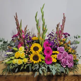 $59.95Product id: 91351 luxurious and lasting. And able to transform any celebration into the mustattend gala of the season. A grand gathering of roses, lilies, sunflowers, stock, alstroemeria and more, beautifully handarranged by our expert florists in a posh cylinder vase. Abundant arrangement of roses, lilies, sunflowers, stock, alstroemeria, poms and monte casino, gathered with fresh salal beautifully designed by our expert florists in an elegant glass cylinder vase; measures 8'h large arrangement measures approximately 22'h x 17'w medium arrangement measures approximately 21. 5'h x 16. 5'w small arrangement measures approximately 21'h x 16'w our florists handdesign each arrangement, so colors, varieties, and basket may vary due to local availability lilies may arrive in bud form and will open to full beauty over the next 23 days Photos at to.bloomnation.com?572421