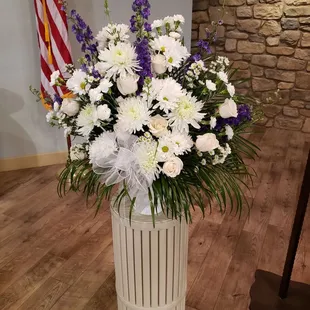 $79.99Product id: 91211 capture all the love, respect and honor a beloved veteran deserves with this patriotic sympathy arrangement. Crafted from the finest white football mums, red carnations, blue delphinium and more, it is a beautiful expression of your sympathy and devotion to a departed hero. Floor basket arrangement of fresh white football mums, red carnations, blue delphinium and more appropriate for family, friends or business associates to send directly to the funeral home our florists use only the freshest flowers available, so colors and varieties may vary measures approximately 32'h x 38'l Photos at to.bloomnation.com?573952
