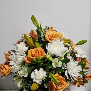 $89.99Product id: 91293 this sympathy standing spray, in shades of peach, orange and white, is a beautiful symbol of your sympathy and support. Peach roses, orange asiatic lilies, white carnations and more an appropriate gift for family, friends and business associates to send directly to the funeral home our florists use only the freshest flowers available so colors and varieties may vary large measures approximately 52'h x 42'l without easel medium measures approximately 46'h x 38'l without easel small measures approximately 42'h x 30'l without easel Photos at to.bloomnation.com?573778