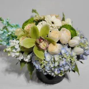 Product id: 100231 send your deepest care and concern during times of sorrow with our precious blue and white sympathy arrangement. The freshest roses, delphinium, lilies, daisy poms and carnations are handdesigned in a stunning cube vase as a gesture of comfort and peace. Elegant blue and white arrangement of roses, delphinium, lilies, daisy poms, carnations and monte casino, accented with variegated pittosporum and myrtle artistically designed by our florists in a classic clear glass cube vase lined with a ti leaf ribbon; vase measures 5'h x 5'd appropriate for the service or for sending to the home or office of friends and family members large arrangement measures approximately 11'h x 11'l medium arrangement measures approximately 10'h x 10'l small arrangement does not include roses and measures approximately 9'h x 9'l our florists handdesign each arrangement, so colors, varieties, and container may vary due to local availability lilies may arrive in bud form and will open to full beauty over the next 23 days Photos at to.bloomnation.com?573935