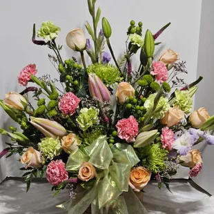 $69.99Product id: 95434 remember a loved one who has passed on with a stunning tribute arrangement. The elegance of pastelcolored roses, lilies, gladiolas, stock, snapdragons and more offers your heartfelt memories of a beautiful life. Lush, pasteltoned arrangement of roses, lilies, gladiolas, stock, spider mums, poms, snapdragons, mini carnations, daisy poms, monte casino and waxflower, accented with variegated pittosporum, salal and myrtle handdesigned by our select florists in a classic glass cylinder vase; vase measures 8'h can be sent to the home of friends, family members or business associates, or to the funeral service large arrangement measures approximately 24'h x 22'l medium arrangement measures approximately 22'h x 20'l small arrangement measures approximately 20'h x 18'l our florists handdesign each arrangement, so colors, varieties, and container may vary due to local availability lilies may arrive in bud form and will open to full beauty over the next 23 days Photos at to.bloomnation.com?572481