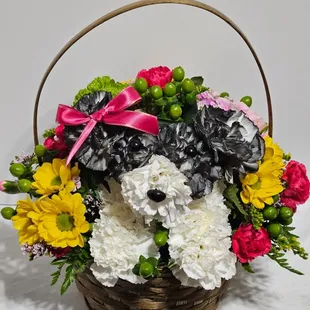 $249.99Product id: 91876 exclusive bark up the right tree for their birthday surprise send our handdesigned adogable arrangement, crafted by our florists with white carnations and playful poms. All dressed up to party down, it's paired with a festive happy birthday balloon and decorative ribbon in a dapper dog bed. It's a gift that's sure to be the pick of the litter. Truly original adogable arrangement of white carnations, poms and variegated pittosporum arranged in the shape of an adorable puppy, complete with eyes, nose and colorful curled ribbon arrives in a willow dog bed basket lined with sheet moss paired with a festive 'happy birthday' 18'd mylar balloon; balloon design may vary due to local availability arrangement measures approximately 11. 5'h x 10'l our florists select the freshest flowers available so floral colors and varieties may vary Photos at to.bloomnation.com?572456