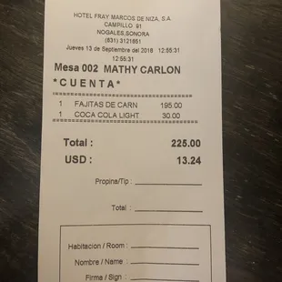 I ate here for lunch yesterday when I was in Nogales. This was my first time in Nogales so I wasn't really sure where to eat. I asked around and a couple of people mentioned Fray. I ordered the fajitas which were pretty good. The rice was a little drier than I like but overall it was a good meal. It was also very inexpensive. My whole meal totaled around 13 bucks. The staff was friendly and the restaurant was very clean. It is attached to a hotel which also looks very nice. Next time I am in town I will have to stay at the hotel for a night.