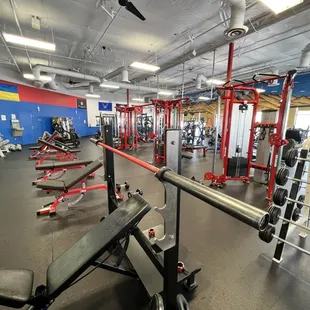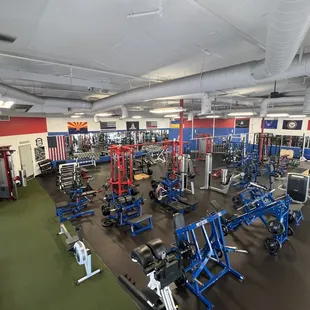 Great selection of equipment for full body strength, isolated strength, cardio that is weight-bearing and non weight-bearing. Free weight, olympic lifting, machine strength options. They have a sled. They have a belt squat. They have safety barbell.