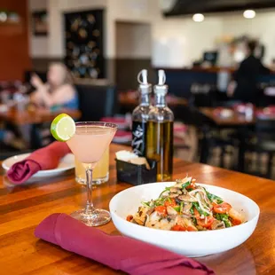 two bowls of pasta and a cocktail