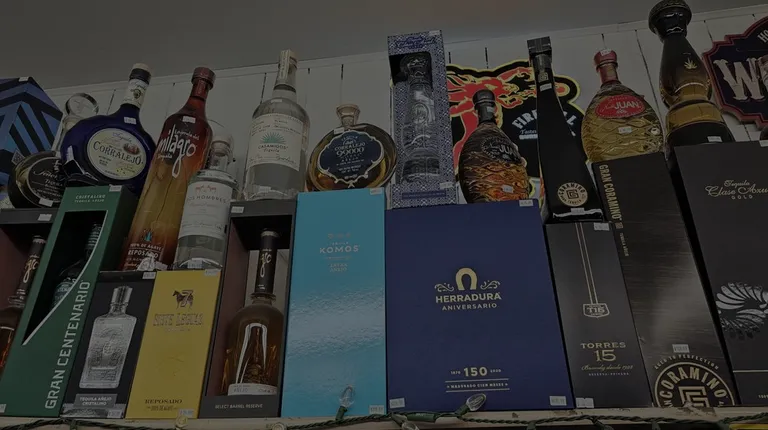 a shelf of liquor bottles