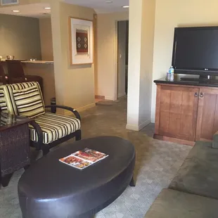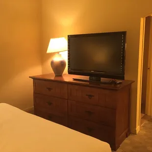King room with a sofa bed, desk and tv stand. Comes with a small fridge but no microwave.