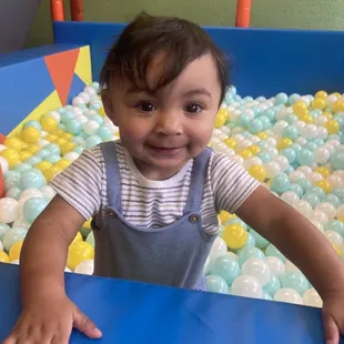 1 year old at play in 2 in under ball pit