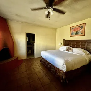 We had a large room, no real sitting area... just a large bedroom. The empty space just inside the entry door makes me believe that at one time, there was furniture for seating in a square, but is just an empty void.Good WiFi, but absolutely no USB ports anywhere in the room.Fireplace in the corner, hot enough to drive us out from under the covers on the chilly night we stayed there.Amazing jacuzzi tub, large bathroom with separate shower and enclosed lavatory. Huge counter with double sinks.Room had an odd odor to it, almost like some sort of cooking smells, like a stale garlic-onion odor and some spice I couldn't name. Our room was right on the boundary of the restaurant, but we weren't able to get rid of it.Very nice layout of the facilities. Only drawback was that overnight guest parking was on the left of registrations and parking (where our room was located) was intended for restaurant patrons. We parked there overnight, as there are no baggage carts and carrying suitcases just wasn't possible. Found that someone backed into my left rear bumper, damaging the paint.Good coffee available in the morning.