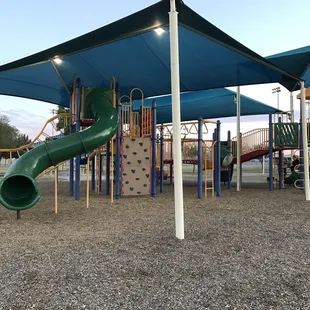 Really clean park just off of I-10. Big swings, restrooms, Ramadas with tables, basketball,a pool, kiddie playground and large playground (but the covered), baseball field, water fountains, soccer field, plus Anita playground on the other side. The biggest bonus for me is that there is an L2 electric car charger (Blink). It's a great stop for charging my car and the kids can run around and burn some energy. You do hear highway noise but the awesomeness of this park makes up for the noise. There is a rubber floor in parts of the playground and wood chips on the other. Sand under the swings. Cool temps with all this grass and the pool cooling it off. Also a paved walking path around the park. Update...and a dog park.And it's lit up at night