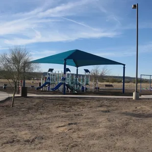 Seemingly in the middle of nowhere is this park, and a pretty nice park at that.Features include a large covered play structure and:* Slides* Bucket, strap, and accessible swings (I call them Cadillac swings, pictured in the center) http://www.yelp.com/biz_photos/MuD-1BbSOhpu32tb_DYxsA?select=SYfwI1y3l7IKogN2wMoi4g* Rock wall* Monkey bars* Picnic table* Restrooms* Parking lot* Dog parkThe ground feels cushioned underneath the bark, which feels safer. We had fun in this park that is a good place for kids and dogs in the vast desert landscape.