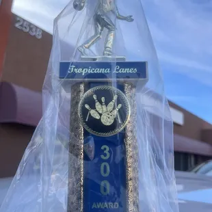 Follow up to a rehab trophy for my Dad, now on Hospice. All I can give him now is a memory. His 300 perfect game bowling trophy