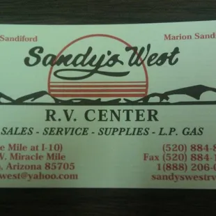 I cannot recommend a business more highly than Sandy's West RV Center. I bought a 2003 Roadtrek on a Dodge chassis from them in Oct. 2015. If you have ever purchased an RV before, you know how complicated it can be - kind of like buying a tiny house and a car at the same time. They made the process so easy.Marion and Dave, the co-owners, showed me the vehicle that interested me most with no sales pressure whatsoever. I was willing to drive up to 500 miles to meet my new (old) RV, but this was the favorite one, after extensive Web searching, right here in Tucson. They worked with me extensively to the last details, from showing me mechanical aspects of her working condition to taking care of all the title/tag/and tax paperwork. Joe, A++mechanic, took four hours to walk me through operation of the various and numerous systems before the sale was even complete. Shawn and Tim, also A++ mechanics, did a lot of work to make sure she'd be in great condition and were extremely helpful and patient in answering my many questions. On top of that, even though the sale was practically a done deal but before I handed over the check, they surprised me with brand-new Michelin tires without raising the negotiated price. Dave, the co-owner, spent a day refinishing a home-made cabinet because they and I didn't like the looks of it. They were confident I was going to buy her but just wanted to make sure everything was A-okay. RV's name is LaVANder. She's an extended camper van with lavender/"Plum" exterior trim and original lavender-ish interior curtains. Gets compliments everywhere we've taken her.Sandy's West is not a fancy or gigantic place, but they stock a lot of supplies for reasonable prices, some of which you can't get anywhere else in Tucson. Locally owned and operated for more than 30 years. Yay!