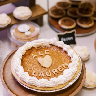 a table with pies and flowers