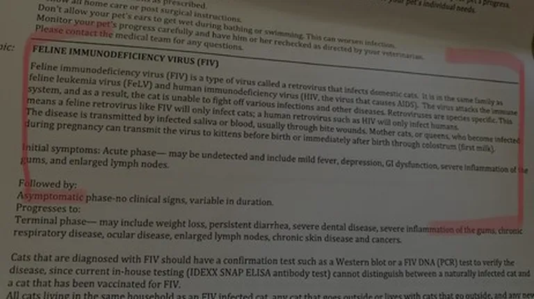 I got my sweet kitty Bijoux on 2/26/19. I took her to the vet on 2/27/19 as she was sneezing when I got her. It cost me $426 to find out she had an upper respiratory infection, both ears infected & she is FIV Positive. I made this breeder aware that I had another cat prior to going to meet Bijoux. Now I have to worry that my other cat will get this potentially deadly disease or find Bijoux a new home with no other cats. It's a very heartbreaking situation for me. I worry for the remaining cats/kittens that this breeder has in his home as Bijoux was a breeder for him for 7 years & all of them may be infected with FIV. His cats roam freely in the home & can transmit FIV to each other. https://www.petfinder.com/cats/cat-health/148-feline-immunodeficiency-virus/https://en.m.wikipedia.org/wiki/Feline_immunodeficiency_virus