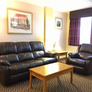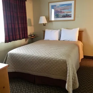 If I had known about this place prior to booking my room elsewhere, I would've done so! This is a great place to stay for $60 a night. It's very clean--I didn't get the heebeegeebees unlike other higher priced hotels. We chose a third floor room which had views of the mountains. The bedroom is separate from the open living room and kitchen area which contained a small fridge, microwave oven and coffee maker. There's also a hair dryer, iron, ironing board and a portable fan. Although there's no free breakfast, the Base Exchange and Burger King are just across the street. And there are several restaurants within a couple of miles outside the base gate as well. If we are ever in the area, we'll stay here again.