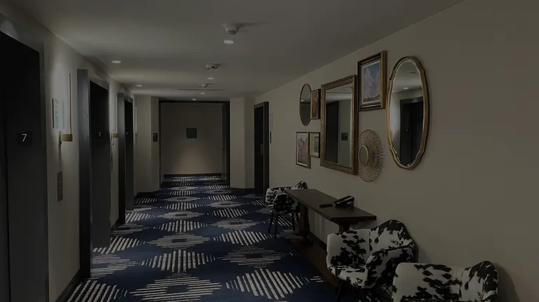 a hallway with chairs and mirrors
