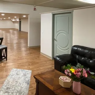 The main event area with 2 bathrooms and a bar/DJ area.