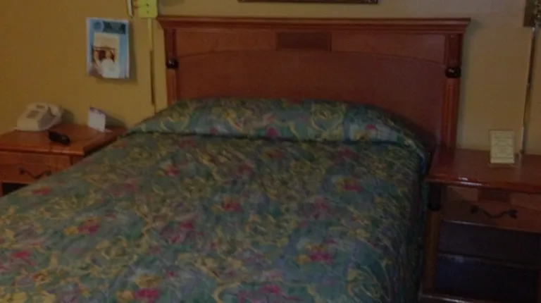 We unfortunately had a bad experience at this hotel. We arrived around 2am & our bad luck there was no other hotel with an available room. We parked & waited in the car because we saw a few people hanging outside on the 2nd floor & around the parking lot. Most of them smoking pot & cigarettes. We remained in the car calling over 20 other hotels with no luck in finding a room available. After I began tearing up I started getting anxious but decided to go ask if they had availability which there was one room 103, I asked if I could see it, the person said no due to covid, so I discussed quickly with my husband I don't like the looks of the place but it was getting very cold & we had driven 6 hours already. So the person said go ahead & see the room, we took a quick peek from the door & accepted because our only other option was to sleep in the car. We noticed a huge crack around the front door, left over soap in the shower tub and around 4am the room upstairs bathroom shower was leaking down into our bathroom floor. We placed towels on the floor & around 8am decided to leave. The beds were made but stank badly, you could tell they do not thoroughly clean & the furniture and structure is very run down. We're still upset to had paid almost $86 dollars for this dump. I don't recommend staying here, and there were homeless camped out in the parking lot to top it off. I'd say we were brave & regret staying here. NEVER AGAIN! I'm requesting my money back!