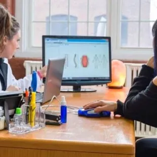 Anna Marie Blessing, B.MSc going over a Biofeedback Health Report with a client.