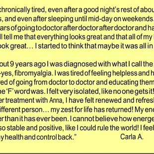 I first discovered biofeedback while desperately searching for answers to relieving my anxiety and stress. I had tried other, traditional forms of treatment and found them lacking in lasting results. Not to mention that there were so many side effects that I felt like a shell of myself. I found Anna and initially tried a few of her EVOX treatments. I noticed very quickly that my anxiety was reducing more and more. My stress levels became much easier to manage and I began to feel a growing sense of wellness and calm. Seeing such great results in the EVOX treatments, I moved on to Anna's biofeedback treatments in order to address chronic fatigue and pain. With each passing day, I feel less pain and more energy than I have felt in probably 20 years. I can finally enjoy what each day brings and enjoy life to the fullest!