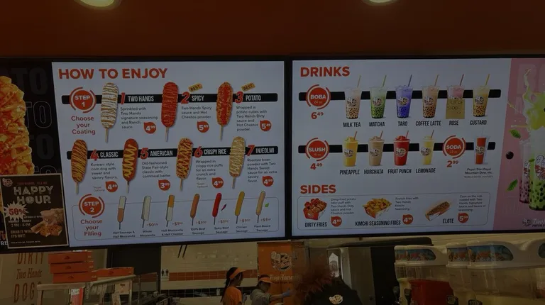 We came to two hands corn dogs on a whim , after visiting the reptile shop next door we decided to have a quick bite . We ordered the American dog #5 with sausage and kimchi fries (not pictured ) . The staff is very friendly and willing to explain the concept of Korean corn dogs . It's pretty small in there maybe holding 6 four top tables but people never seemed to have an issue finding a seat . We will plan to make it a routine to get a corn dog before getting our bearded dragons food next door .