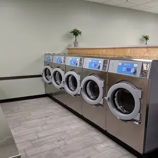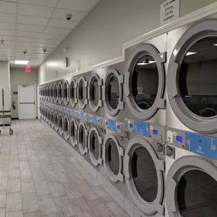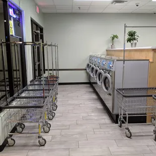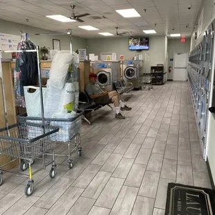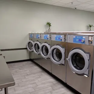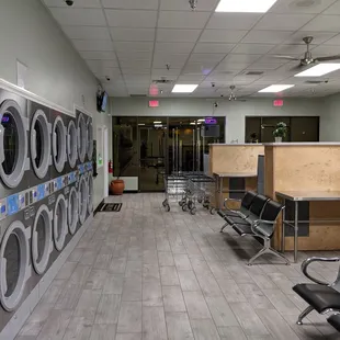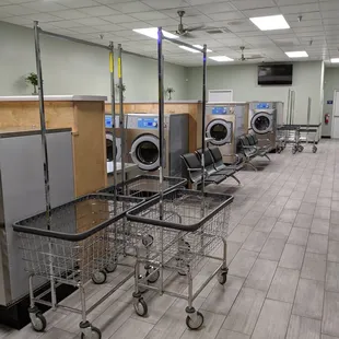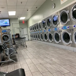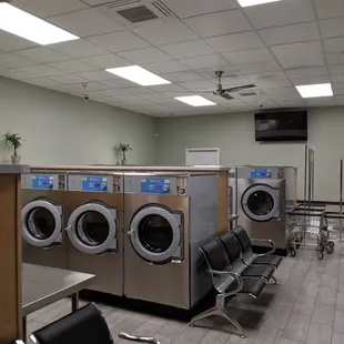 Clean, lots of washers/dryers. Staff on site. Seating available as well as the use of carts and folding tables. The large washers are very expensive, but off set by the cheap dryers. I liked the ability to pay without using quarters also! Very easy to set up on the Pay Range app. No water basin on site, but the opportunity to buy lots of cleaning products was.