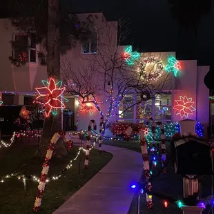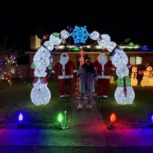 This neighborhood all comes together to do over the top yard and house displays. And collect for the food bank. Hundreds of people spread out over a dozen streets enjoying the lights. This was a good Christmas Eve idea. Strolling together with a long Time friend. No hurry!
