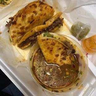 4 Famous Birria Tacos with Consume Platter with Jalapeños added & Steak Rustic Quesadilla