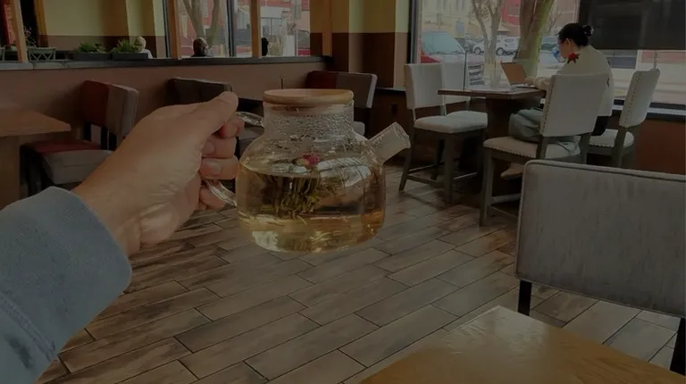 Brick building on a corner. Order at the counter. Food and drinks are brought out to you by the staff. Ordered a Caramel macchiato and half pot of the Korean Evergreen tea. $11.41Cool there is a tea focused cafe, that's rare. The Caramel macchiato is pretty good. The evergreen tea is quite sparse as far as the tea content in the half pot. The spring acts as a strainer, but leaves end up in every glass of your sips. The tea doesn't have much flavor to it, it's quite subtle and tastes mostly like a hot water. I do like the small double insulated cha cup, works well and keeps it cool to the touch.