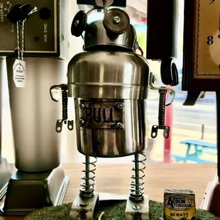 If I made a list of the Top Hundred Reasons Why I Love to Visit Tulsa, this place would be pretty close to the top of the list. I make a point to stop here every time I visit the city. Of course I'm going to tell you why. I'm a Yelp Elite, that's how we do. LOL!First of all the shop is right on Historic Route 66, and I love how Oklahoma celebrates The Mother Road. Buck Atom's is located in an actual Route 66 gas station dating from the 1950s. The building was originally a Pemco Gas Station.Buck's calls itself a Cosmic Curio shop which might seem like a high falutin' name for a Souvenir Stand. But the name is totally appropriate because this is no ordinary souvenir stand. While they have plenty of souvenir items you would expect to find, like stickers, keychains and coffee mugs, they also boast a healthy selection of one of a kind Steam Punk and Sci-Fi items created by local artists.Take for example, the fantastic selection of Rayguns and Robots for sale. The Rayguns are crafted so meticulously that you almost can't believe they aren't operational. As fantastic as the Rayguns are, the Robots are even more appealing to my eye. Every time I visit Buck Atom's I spend most of my time appreciating the Robots. There are so many different kinds. Check out the photos attached to my review. There are a few very disirable commercially manufactured Robots. But the most interesting Robots here are those built from recycled materials. Some are cobbled together from discarded electronics, some from random kitchen utensils and old timey metal spice containers. All of them make me smile. Next visit I'm going to buy one of those fantastic Robots. I doubt that it would ever pass the TSA screening at the airport, so I'll probably have to mail it to myself. But whatever, Ima gettin' me one. One of the highlights of my most recent visit was discovering the OKIES trinket machine. For $5 a turn, this machine dispenses a little plastic figurine of one of five different famous Okies (Will Rogers, Buck Atom, Bass Reeves, The Golden Driller, Wiley Post). Soon as I saw that trinket machine I couldn't get out my money fast enough. I traded a five spot for a token from the counter person and slipped it into the slot. I turned the handle slowly and deliberatively. The capsule dropped down the chute with a very satisfying clunk. I was stoked that I got a Bass Reeves! Hell yeah! If I would've been able to choose my OKIE, that's the one I would've picked. As a souvenir stand, you will be hard pressed to find a better one than Buck Atom's Cosmic Curios. If you're looking for something to remember Tulsa or Oklahoma's section of Route 66 by, they've got a million choices here. That impressive selection of souvenirs, the fantastic Ray Guns and the mind blowing menagerie of Robots is why Buck Atom's gets 5 stars from me. Mikey C says: I love this place!