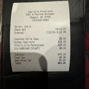We really enjoyed our meal and dining experience at Capriccio's. Bless our servers heart, it was a business dinner, so waited on the other party and wanted to visit a while before ordering. She was very patient! The wine selection is nice. The salads are definitely shareable. I had just plain fettuccini and I thought the sauce was very good. My husband had the tomato sauce on his pasta which was pretty spicy but he loved it. Our guests thoroughly enjoyed the veal and also a pasta with bolognese sauce. It was not spicy. The portions were plentiful and we took home some leftovers for the next day. They also served bread with olive oil and vinaigrette. The white tables cloths give an upscale appearance and we would not walk in wearing shorts. We definitely will return.
