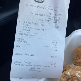 This makes my 3rd attempt to eat at this Location. it's always the service for me. I'm understand being under staff and busy - but it really what it is everywhere.This location has its list of wows.I finally made an ordered today ....i have pulled away several time for several service reasons....Lets add - wasn't worth it.Order a two piece combo at $10.19, was charged 11.89 before taxI ordered double mash for my sides - no spoon - I gotta forkkk (clearly paid for a spoon)No condiments (salt, pepper, hot sauce, or etc).....wasn't asked Just took my order and handed me my order - no smile - no service...so transactional.My chicken breast was chewy and the uncooked wet flour was found under some layers of the chicken skin (yuck) The mash was cool - please serve them hot (I know the container is styrofoam - but yes)Please silently robbing customer , let your menu match watch your charging Services 2, Food 2, Ambiance 0