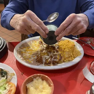 Ordered cheese and onion enchiladas with eggs on top. I am a run of the mill vegetarian. The enchiladas that came were covered in a meat sauce. The way my dog went after them I thing the enchiladas were meat filled. It was horrible. I was so hungry.The salsa was great. My husband enjoyed his shrimp dish. Most Mexican restaurants are veggie friendly. Not this one. My new years eve dinner was a total loss