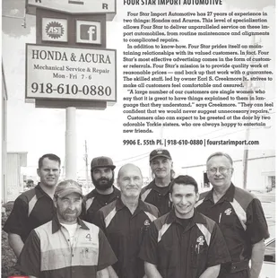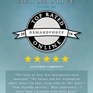 Probably the best independent shop in the Tulsa Oklahoma area. The staff is always trained everyone certified extremely honest people they'll do everything they can to treat you like family. I will continue to bring my family cars and my friends cars to this location.Very friendly and honest staff excellently train technicians, wonderful place to bring your car. I will continue to do business with four-star.SincerelyGary Byrne