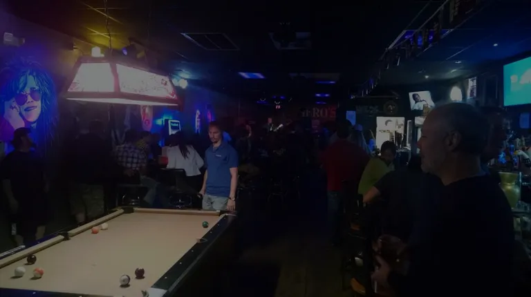 a group of people playing pool in a bar