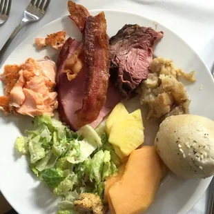 Biscuits and gravy. Bacon. Fresh fruit with mint. Caesar salad. And amazing chocolate mousse.