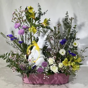tulip blooming plant in a handled wicker basket decorated with ceramic bunny and over sized Easter egg, and spring ribbon