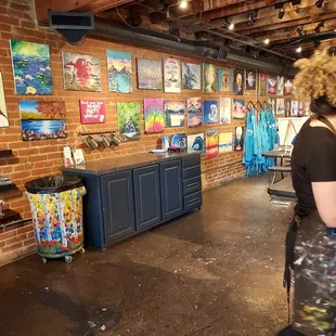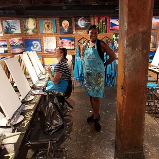 I was visiting a friend in Oklahoma and she suggested we hang out in OKC and paint.Bee was our teacher and Marina assisted with the painting and tended the bar.The available drink options are water, pop, wine, beer, white claw and bottomless mimosas are $12.You are able to bring food but will need to eat at a different station that is set aside. Our teacher Bee was a very talented artist. She was very patient and kind and always offered assistance, even helping if we made a mistake or needed guidance. She wanted to make sure we all were happy with our work.The studio is located in Bricktown in Oklahoma City. There is a nice canal with boats and plenty of restaurants bars and night clubs.We had a very nice time and our pictures turned out very nicely. You will need to make a reservation... We went on a Sunday night and all the seats were full.