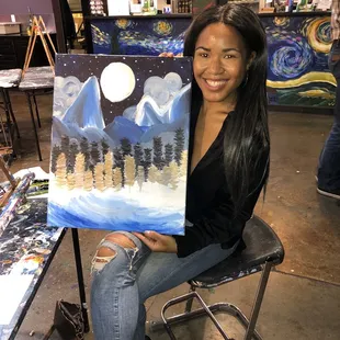 The painting was a 5 star experience. The instructor was amazing!! She was very thoughtful, and she helped us when needed. The only thing I would not recommend is the beverages. I am a extreme lightweight. I only drink maybe 1-2 beers a week tops. I'm also skinny. Paid $8 for a "Bob Ross" (1 shot of Malibu) It was by far one of the weakest drinks I've EVER HAD ! When I tell you that I tasted (nor felt) any alcohol. I really mean it. I then told the 2 ladies up at the bar. They basically told me to get lost. Passive aggressive for no reason The thing that got me.... THE BARTENDER DOESNT DRINK ALCOHOL what bartender doesn't drink alcohol? I will never come back to this location ever again.