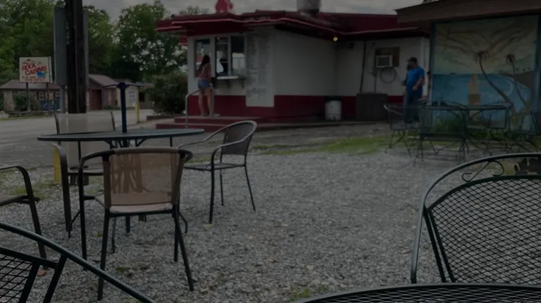 we heard they were pretty good and that they had a ding room. Not quite. They have a patio off to the side with tables/chairs. I'm giving 3 for the food. Anyway, my hamburger was quite good. We're from tenderloin sandwich country where the loin is pounded thin and hangs out the bun. not here. see pix. he was gravely disappointed. the wait is long. I'd say, from sitting in line & ordering, 20-45 minutes After you order. now we were entertained by a charming little girl who climbed into the order window to sell us pink cotton candy. hubby's a softy a gave her $4 for the sad looking sack. quite a while later she returned to reimburse him a couple bucks. he laffed and had her put it in the tip cup. Oh, life at the lake.