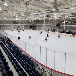 Great sports bar located on the second level of WeStreet Ice Center. The space is huge with plenty of seating, lots of tv screens, and a bar towards the back. I like that the decor is new and updated but it's very casual. When we walked in we were quickly greeted and told we could sit anywhere.There are large windows along both sides overlooking the two skating rinks. It was fun to sit by the window and watch the figure skating competition that was going on while we dined. The food was good. We split the Puck burger and fries and it was better than I expected. Normally I'm not a fan of bar food, but everything tasted freshly prepared. The fries were crispy and seasoned well.Service was very friendly. There was a small mix up with our order and management seemed a little flustered at first, but they made sure we were taken care of and got the right order. All the servers we encountered were super friendly and good about checking in on us regularly. Great place to hang out with friends or grab a drink/bite to eat, especially if you're a hockey fan.