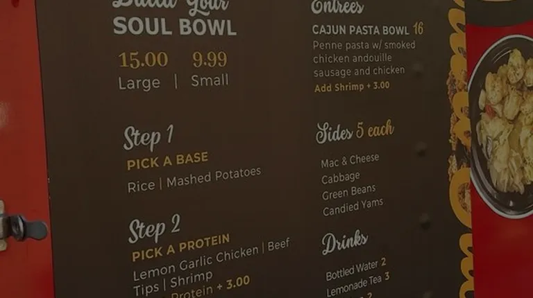 I gotta small Soul Bowl with rice, lemon garlic chicken, candied yams & green beans. The moment I took the first bite, it brought me back to my adolescence when I had chicken & rice and the rice would be so perfect. As I got older (& started learning how to cook), I found out the main trick was chicken stock. I didn't want the bowl to end. Plenty of rice, plenty of chicken, plenty of green beans, plenty of candied yams. There's no need to add extra, not even hot sauce, just leave it as is. As a small, it still had more than a lot of food. With a large, I'm confident it could be shared or you'll be guaranteed to have leftovers.Outside of the chicken, you can get beef tips or shrimp. Instead of rice, you can get mashed potatoes. There are two other sides outside of the ones I chose: mac & cheese and cabbage. The small bowl came at $9.99, I got a separate side of mac & cheese and my whole order came out under $20. The person who took my order was super nice. With about 5 people in front of me, the food came out not even 10 mins later. I'd like to try their beef tips & mashed potatoes next time.