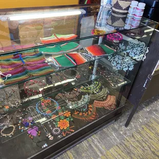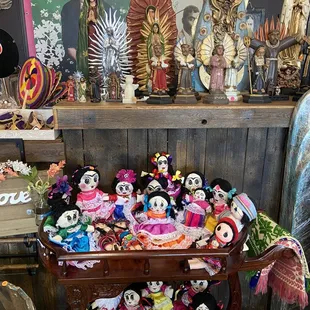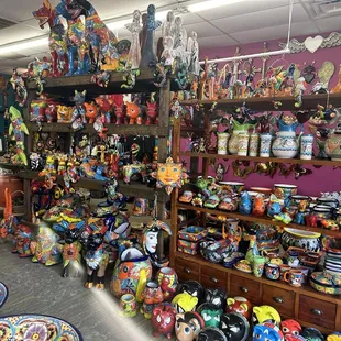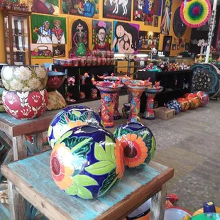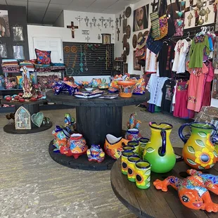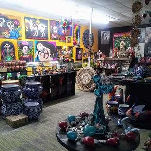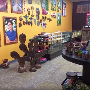 Prices are too high... but she has alot of quality pieces from wall hanging to dishes to fabrics to pillows to jewelry. Nice stop to find authentic Mexican products. Lot of clay pottery and art works. Talavera Pottery. Day of the Dead statues and skulls are plentiful.. jewelry was beautiful and lots of varieties but bitPricy for me . Store is neat and clean go take a gander