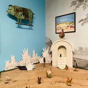 The Abby Aldrich Rockefeller Museum occupies a portion of the old Publick Hospital (aka the first mental institution in the US and part of Colonial Williamsburg) along with the DeWitt Wallace Decorative Arts Museum. It is well worth the detour a bit off DOG Street in order to check it out. Your Colonial Williamsburg pass gains you entry.Abby Rockefeller was the wife of John D. Rockefeller, who was single-handedly responsible for resurrecting Colonial Williamsburg from the brink of decay and provided the funding to open and maintain it as it is today (thank you, thank you, John D. Rockefeller). Abby was always interested in art -- and probably best known for establishing MoMA in NYC -- and was one of the first to recognize folk art as a viable art form, unique to the US, to be collected and admired. She began collecting Colonial folk art during the Rockefellers' involvement in rehabbing CW, and her collection is now part of the wonderful little Abby Aldrich Rockefeller Folk Art Museum.The museum -- along with the DeWitt -- is small enough to be managed in one afternoon...or morning...or few hour period. And the folk art is bright, whimsical, ironic, and fun enough that kids will really enjoy the exhibits, too. There's a roomful of those iconic, flat portraits that so typify American folk art; husband and I had a great time giggling over the big-eyed cats included in family portraits, and the large-headed children in nightgowns.Other exhibit rooms include one that children will absolutely adore -- a full mock-up of a farm, with the walls painted Prussian blue with clouds, and the floor painted bright green with barns and those white split-log fences. The room houses "animals throughout folk art" and includes duck decoys, weather vanes, and other animal sculptures. A storybook dog accompanies you through the exhibit.My favorite room was the "unintentional" folk art: objects like drug store Indians, weather vanes, old-timey storefront signs, and carousel animals. And while we were visiting, there was a special quilting exhibit full of beautifully crafted quilts from Colonial to modern.The AARFAM is certainly worth a visit while in Colonial Williamsburg. It's something the whole family can enjoy, and you won't find a collection of folk art like this just anywhere.