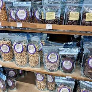 a variety of nuts on a shelf