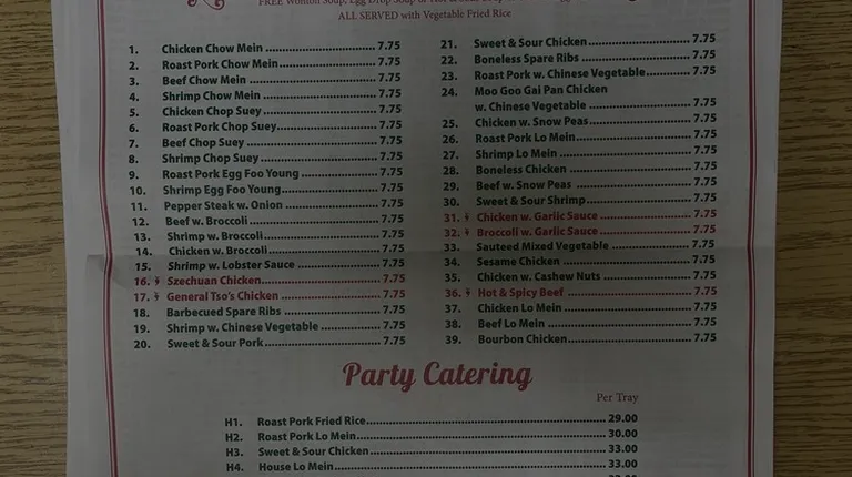 Old chicken that was so tough and inedible in my general tso's it was gross. Low mein with veggies the veggies were extremely overcooked.Spring rolls and crab ragoons were okThe interior of this restaurant was rough even by Chinese place standards.