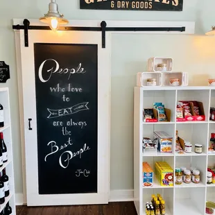 a kitchen with a chalkboard menu on the wall