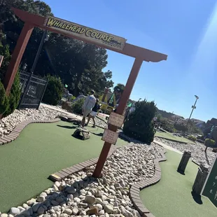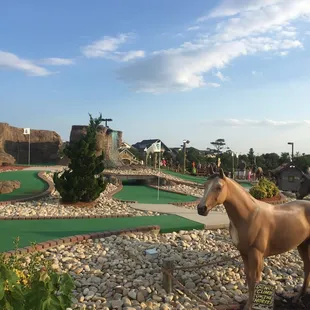 Not the golf adventure we were hoping for. Filthy bathrooms with no toilet paper first thing in the morning! It was blazing hot and there was no shade anywhere. If you were thirsty because of the blazing heat, you'd HAVE to buy a drink because no one is using the water fountains. There was trash everywhere. The sign said don't walk on the rocks. But there were few paths to walk on and we constantly didn't know where to stand. One of the bushes was overgrown and as a left handed player, I had to back into the bush to hit my ball from the starting point. Definitely will never go here on any future trips.