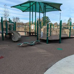 I like this playground because isn't as crowded as the other parks, depending on the time you go I guess. I like that the ground is padded in case the kids fall and I like that the park isn't too small or too big allowing you to keep an eye on your child if you decide to sit on a bench. I like that there are plenty of benchs too, one section has picnic tables with some shade. They have one swing that you can sit with your child and swing simultaneously. It has plenty of slides, climbing apparatuses, and is appropriate for toddlers too. There is plenty of parking right in front of the park which is nice and the bathrooms are clean, they have a toddler sized toilet, baby changing table -but there is not any step stools for hand washing for toddlers. There is a dog park right adjacent to the park. Dog lovers use the same parking lot as the playground parking lot. There also seems to be a trail you can walk around the park. Over all this park is well kept all around and I actually feel safer at this park than I have in many others in the community.